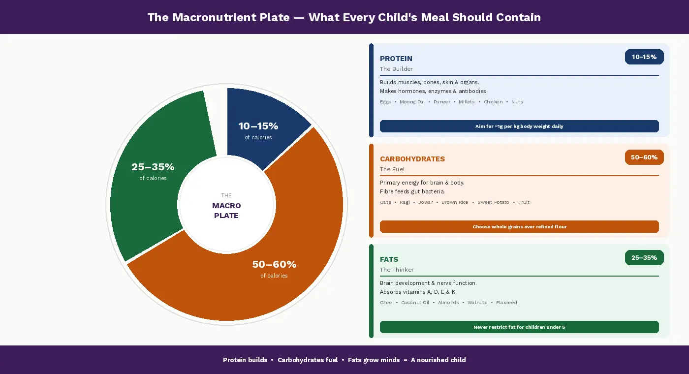 Macronutrients are not diet concepts. They are the fundamental chemistry of how your child's body works. Protein builds it. Carbohydrates fuel it. Fat protects and enables it. All three are necessary. All three work best together.
